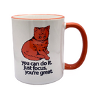Orange Focus Cat on a white mug with orange rim and handle. Cat is on both side so you can see focus cat and everyone else can as well. Get your morning started the right way with some coffee or tea in your new favorite mug.