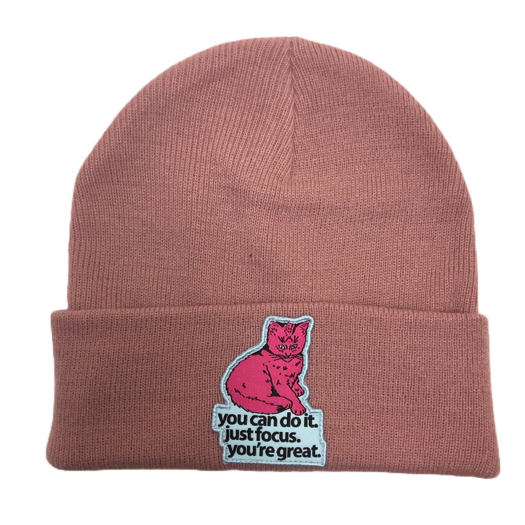 Focus cat patch sewn on to a soft pink, tight knit, cuff style beanie.